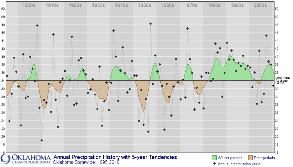 Since the 1980s, Oklahoma has been, on average, wetter and wet for longer than in previous graph history.