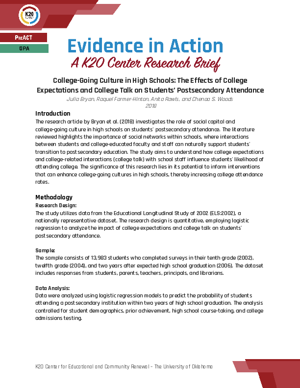 This brief explores how high school staff's college expectations and college-related interactions with students significantly increase the likelihood of postsecondary attendance. Key strategies include fostering strong social networks, setting high expectations, and providing timely college information.